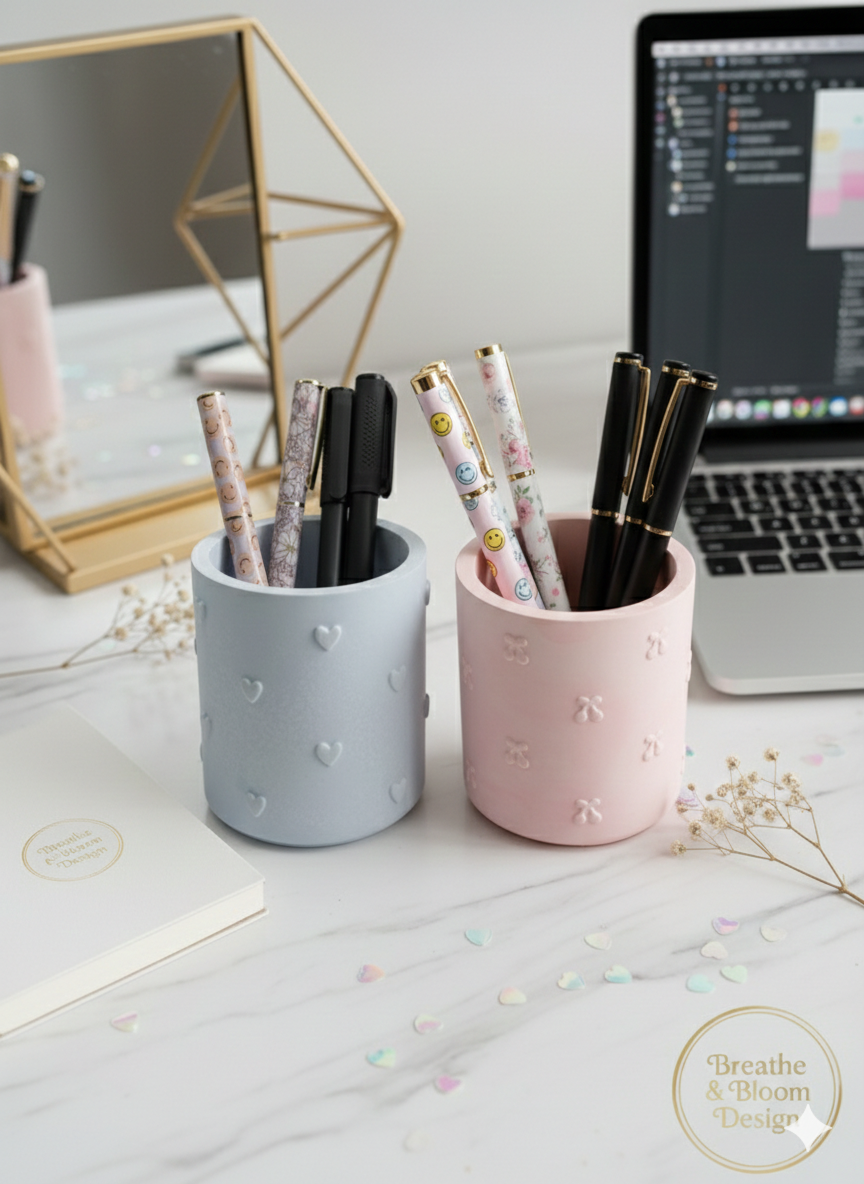 Declutter with style and soul. Our heart-embossed pen cups are hand-poured from eco-friendly casting composite, offering a heavy, stone-like feel with a velvet-matte finish. Perfectly sized for pens, makeup brushes, or artist tools. Available in Soft Sky Blue and Blush Petal Pink.